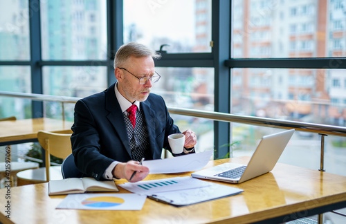 Thoughtful businessman working in cafe. Adult man in dark suit doing paper and online work with a cup of coffee.