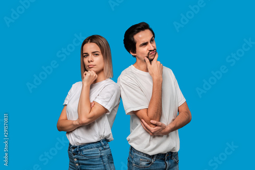 Thoughtful couple of a bearded brunet man with mustache and blond woman in white t-shirts and blue jeands standing isolated over white background.