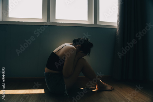 Thoughtful girl sitting on sill embracing knees looking at window, sad depressed teenager spending time alone at home, young upset pensive woman feeling lonely or frustrated thinking about problems