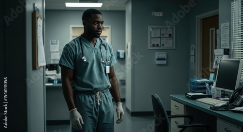 Thoughtful Male Doctor in Scrubs Standing in a Well-Lit Hospital Room