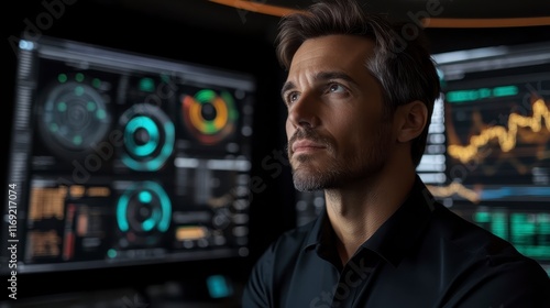 Thoughtful Man Analyzing Data on Computer Screens Business Finance Technology
