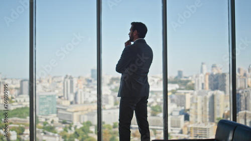 Thoughtful man looking panoramic window in office. Legal manager contemplating