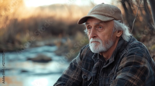 Thoughtful Older Man by a Stream in Autumn Landscape Setting