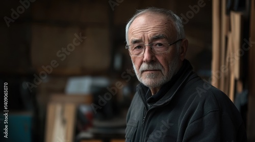 Thoughtful senior man with gray beard and glasses sitting in a rustic workshop, reflective mood, showcasing wisdom and experience in craftsmanship