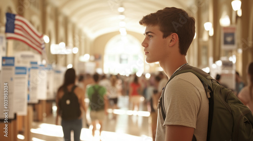 Thoughtful student in a busy educational corridor
