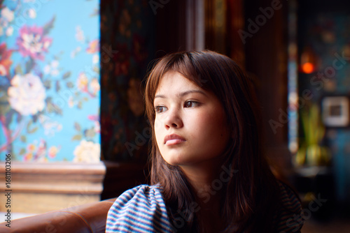 Thoughtful teenage girl looking away while sitting on sofa