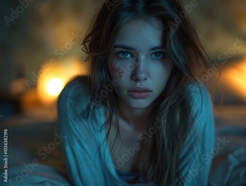 Thoughtful woman lounging in bed, soft light ambiance creates an intimate atmosphere.