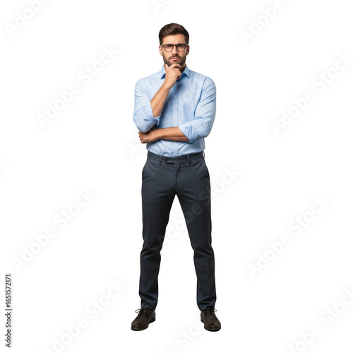 Thoughtful young caucasian male in blue shirt and glasses standing pondering isolated on transparent background