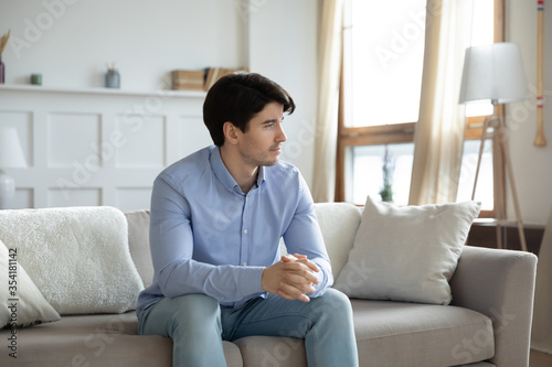 Thoughtful young caucasian man sit on sofa in living room look in window distance pondering or planning, pensive millennial male lost in thoughts thinking or dreaming at home, rest on couch on weekend