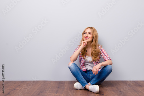 Thoughtful young cute smiling woman sitting on the floor and thinking about her dreams