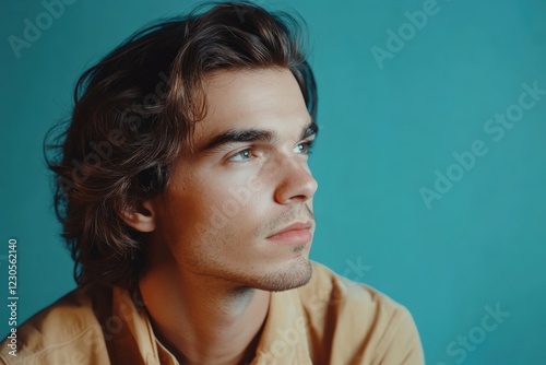 Thoughtful Young Man with Wavy Hair Against a Turquoise Background