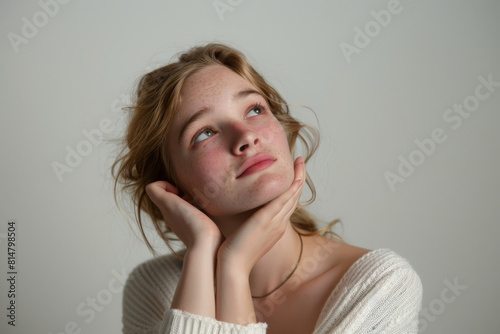 Thoughtful young woman gazes upwards, hands on cheeks, against a clean studio backdrop depicting contemplation and introspection