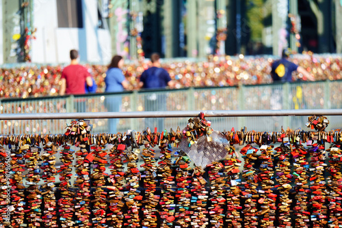 thousands of love locks on the railings of the hohenzollern bridge in cologne's old town with tourists and train in the blurred background