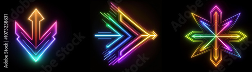 Three abstract neon signs with different shapes in rainbow colors on a black background.