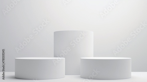 Three abstract white minimal geometry shape product display podiums on white backgrounds, showcases for graceful cosmetic products display, copy space, mock up.