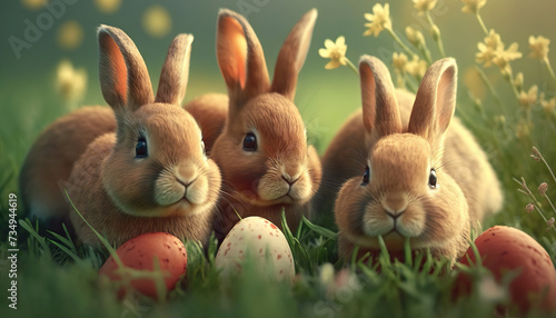 Three adorable bunnies nestled among Easter eggs and spring flowers