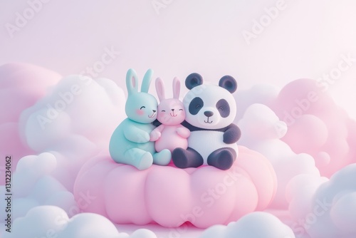 Three adorable cartoon animals, a blue bunny, a pink bunny, and a panda, snuggle together on a fluffy pink cloud.