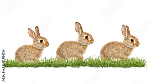 Three Adorable Rabbits Hopping on Green Grass in a Bright Setting