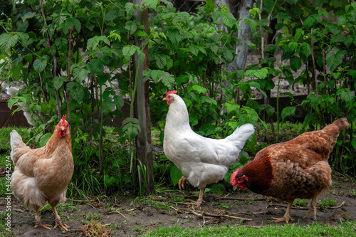Three adult chickens are walking in nature. Hens of white and variegated color on a background of green leaves in the garden. Free-grazing domestic hens.