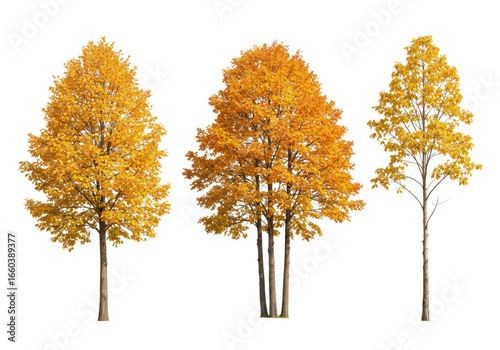 Three autumn trees with yellow and orange leaves isolated on transparent background