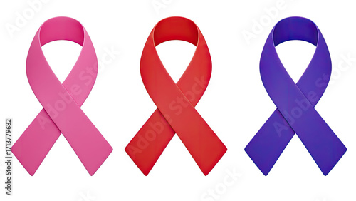 Three awareness ribbons in pink red and purple representing different causes isolated on transparent background
