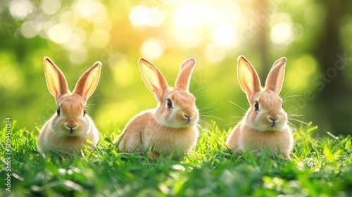 Three baby rabbits in sunlit grass