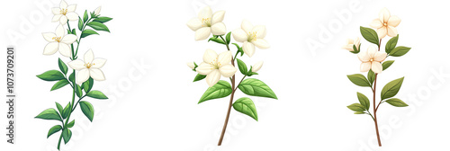 Three beautiful jasmine flower branches on a white isolated background. transparent background