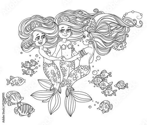 Three beautiful mermaid girls swirl in dance surrounded by fish outlined isolated on white background
