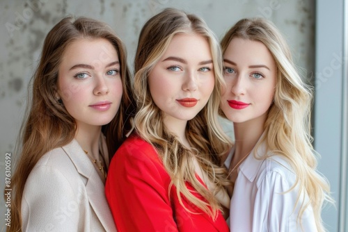 Three beautiful women, each with her own unique style, stand close together, radiating confidence and elegance. Their bright smiles and captivating gazes suggest a sense of camaraderie and shared joy