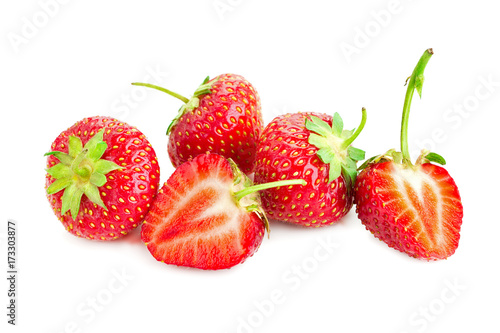three berries of ripe juicy strawberries on white table