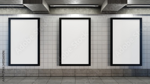 Three billboard mockup led in the subway station for advertising 3d render illustration. Lightbox poster mockup