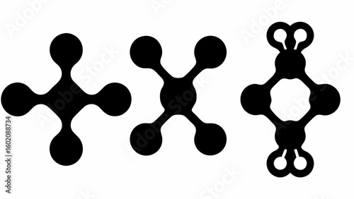 Three black abstract shapes with rounded edges and circular elements on a white background design art
