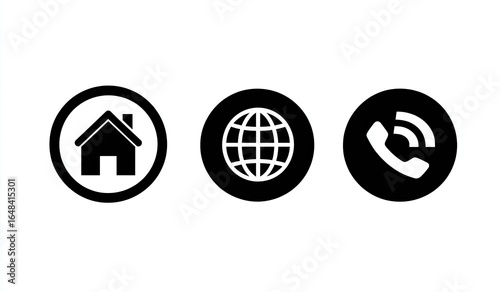 Three black icons on white background. Home, global, and phone icons. Each icon in a circle