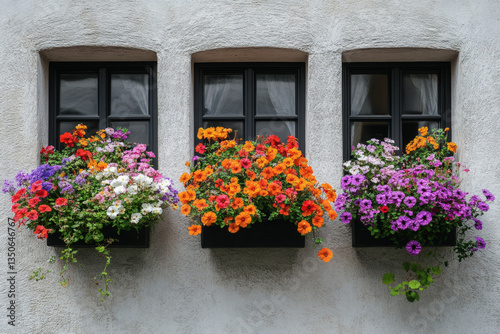 Three Black Window Boxes with Blooming Flowers Adorning Textured White Wall Creating a Colorful Facade on a Traditional Building Exterior