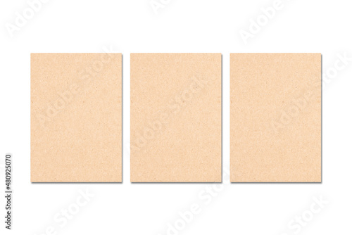 Three blank brown kraft paper cards, vertical A4 poster or business card mockup on a white background. Flat lay, top view. For advertising, brand design, stationery presentation.