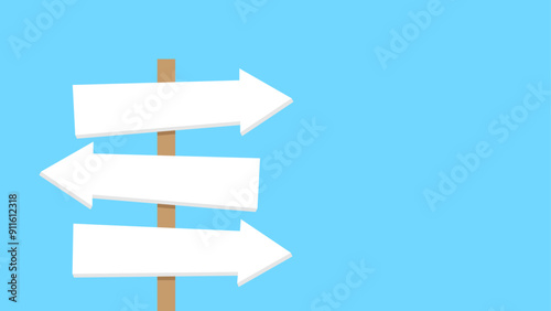 Three blank white arrows on a wooden signpost pointing in different directions, set against a bright blue background. Choice of path, several directions..