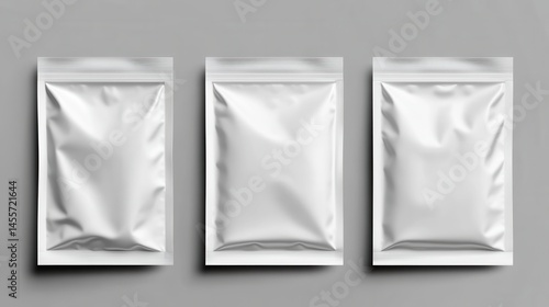 Three Blank White Foil Sachet Packaging Mockups on a Gray Background for Branding and Design Projects
