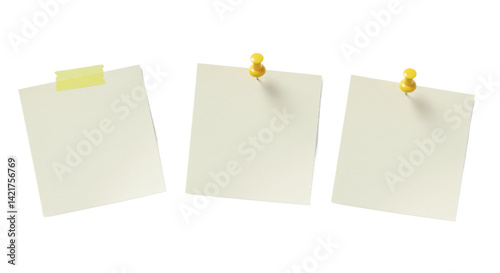 Three Blank White Note Papers with Yellow Pins and Tape on Transparent Background