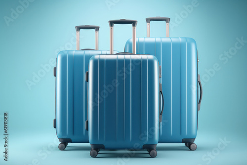 Three Blue Polycarbonate Travel Suitcases on Wheels on Blue Background. Generative AI.