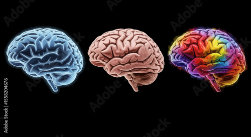 Three Brain Illustrations Blue Brown and Rainbow on a Black Background