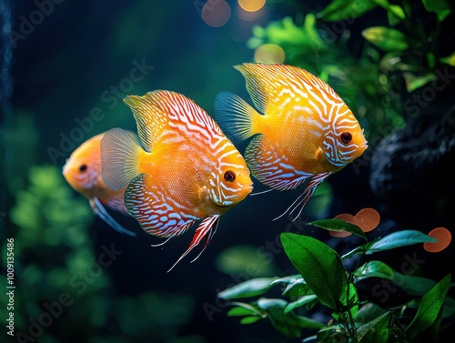 Three brightly colored fish swim in an aquarium.