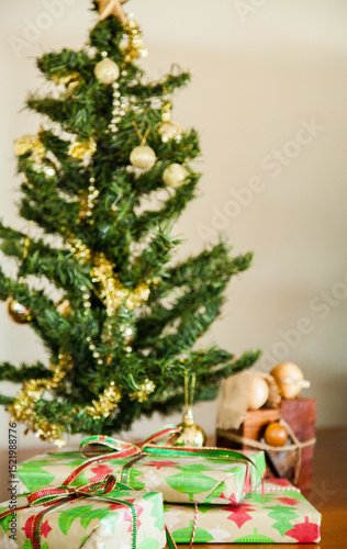 Three brightly wrapped Christmas gifts under a small decorated tree