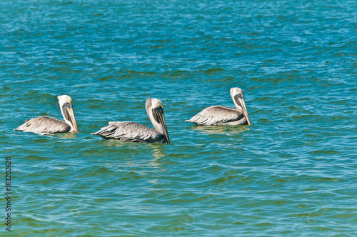 three brown pelicans / three brown pelicans swimming in a straight line on an autumn, tropical day in the Gulf of Mexico