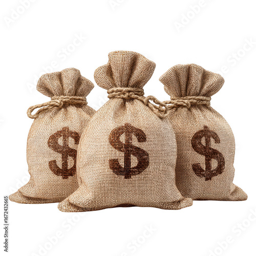 Three burlap money bags with dollar signs prominently displayed isolated on transparent background