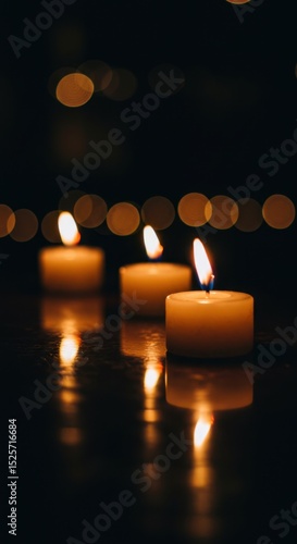 Three Burning Candles Illuminating a Dark Room, Peaceful and Serene Atmosphere, Reflecting on a Polished Surface