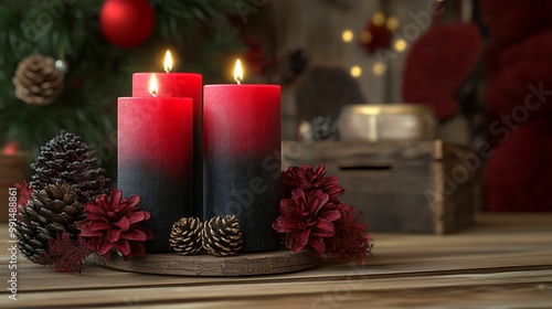 Three burning red and black gradient Christmas candles surrounded by pinecones and festive decor, creating a warm and cozy holiday atmosphere.