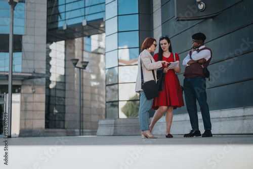 Three business workers engaged in conversation with documents in hand, standing outside a corporate building.