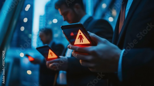Three businessmen holding smartphones displaying a caution symbol for pedestrians.