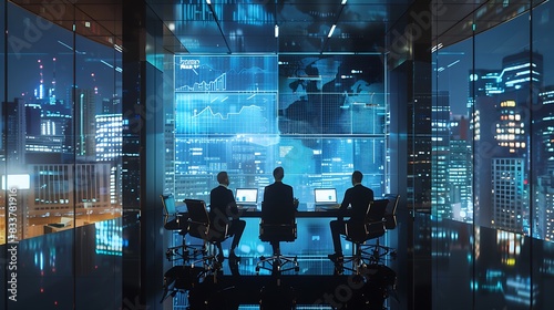 Three businessmen look out over a futuristic city skyline from a high-tech office.