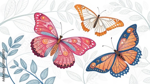 Three Butterflies with Floral Composition Watercolor, Line Art, Nature, Butterfly Illustration Keywords Butterfly, Floral Art